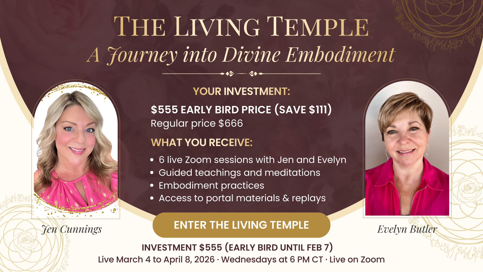 Thank you for stepping into this sacred container. Early enrollment gives you full access to the six-week live experience with Jen Cunnings and Evelyn Butler. Each week you will receive live teachings, meditations, sound healing, Light Language, and guided practices that support deep inner integration.