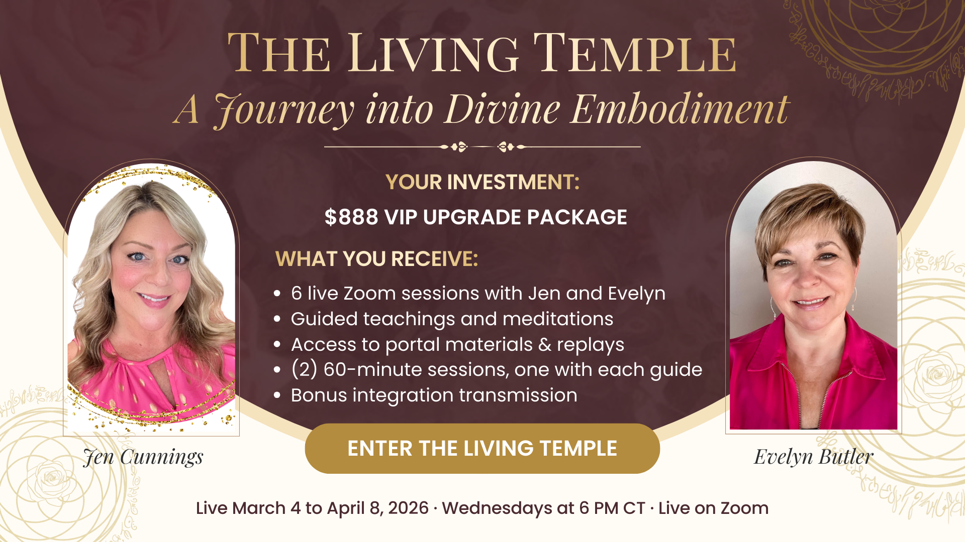 Your VIP enrollment offers the full six-week live experience with Jen Cunnings and Evelyn Butler, along with additional personal support to deepen your integration. Alongside the weekly sessions, you receive two private 60-minute sessions — one with Jen and one with Evelyn — plus a bonus transmission to support your process.
